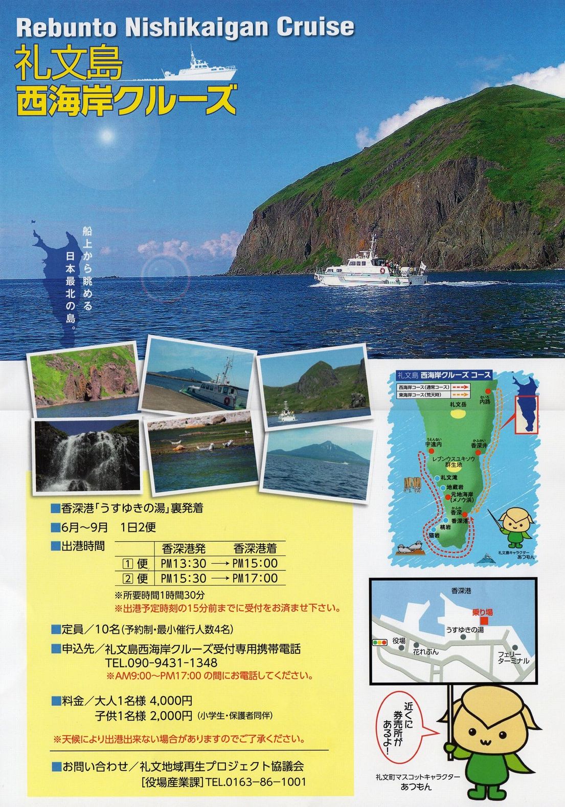 所要時間は1時間半で予約制です。定員10名まで。海側からでないと見られない景色がご覧いただけますので、この機会にぜひお申し込み頂いてはいかがでしょうか。ご興味がございましたら『礼文地域再生プロジェクト協議会(役場産業課』までお問い合わせくださいませ。 TEL: 0163-86-1001